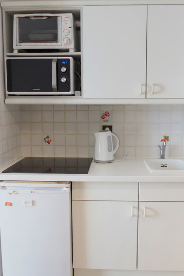 Appartement 2-kamers 30 m2, op verhoogde begane grond, op het zuidoosten gelegen. Eenvoudig ingericht: woon-/eetkamer met panoramavenster met TV en ventilator. Uitgang naar het terras. 1 kamer met 1 2-pers bed (1 x 140 cm, lengte 190 cm), ventilator. Cabine met 1 x 2 stapelbedden (90 cm, lengte 190 cm). Kookhoek (mini-oven, 3 keramische glas kookplaten, broodrooster, waterkoker, elektrische koffiemachine). Uitgang naar het terras. Badkamer, aparte WC. Verwarming. Terras 5 m2, overdekt, op het zuiden gelegen. Terrasmeubelen. Ter beschikking: strijkijzer, haardroger. Internet (Internet (WiFi), extra). Parkeerplaats nr. 379. TV alleen FR. Rookmelders. In plaats van een afgesloten slaapkamer bevinden sommige slaapgedeeltes zich in een open ruimte (galerij, nis, etc.). 831070002237H