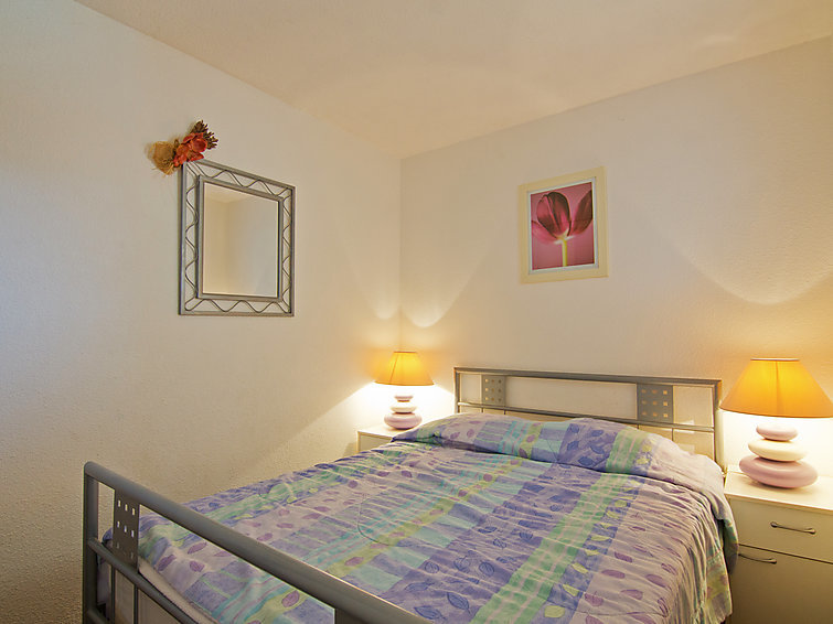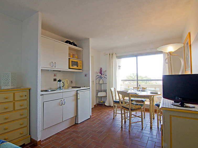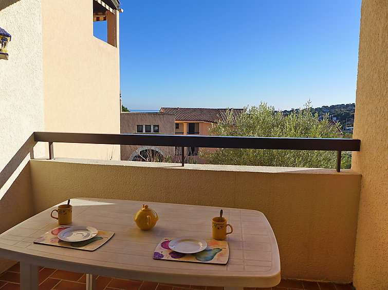 Appartement 2-kamers 40 m2 op de 1e verdieping. Eenvoudig ingericht: woonkamer met panoramavenster met TV (Flatscreen TV), DVD en ventilator. Uitgang naar het terras. Cabine, zonder kast met 1 x 2 stapelbedden (80 cm, lengte 190 cm), ventilator. 1 kamer met 1 2-pers bed (1 x 140 cm, lengte 190 cm), ventilator. Kookhoek (2 inductiekookplaten, broodrooster, waterkoker, magnetron, elektrische koffiemachine). Douche, aparte WC. Elektrische verwarming. Terras 5 m2, overdekt. Terrasmeubelen, ligstoelen (2). Beperkt uitzicht op zee. Ter beschikking: wasmachine, strijkijzer, haardroger. Internet (Internet (WiFi), extra). Parkeerplaats nr. A151/472. 1 klein huisdier/hond toegestaan. TV alleen FR. Rookmelders. In plaats van een afgesloten slaapkamer bevinden sommige slaapgedeeltes zich in een open ruimte (galerij, nis, etc.). 83107000216J5