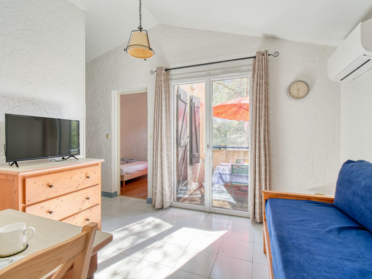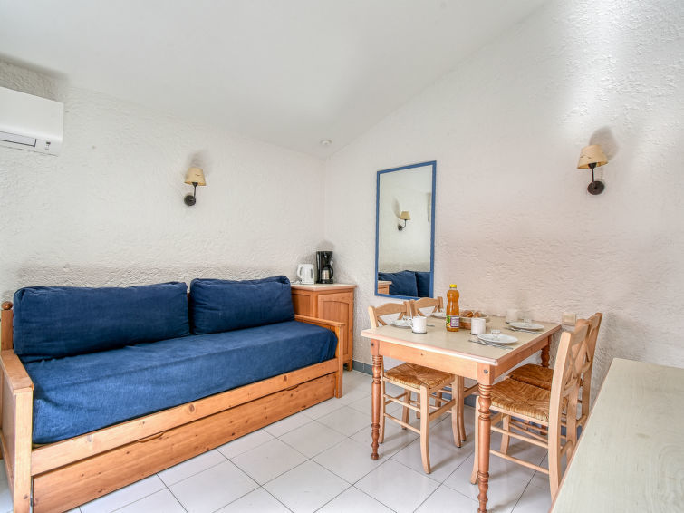 Appartement 2-kamers 26 m2 op de 3e verdieping. Woon-/eetkamer met 1 uitschuifbaar bed (2 x 90 cm, lengte 190 cm), TV en elektrische verwarming. Uitgang naar het terras. 1 kamer met 1 2-pers bed (1 x 140 cm, lengte 200 cm). Open keuken (afwasmachine, 4 keramische glas kookplaten, broodrooster, waterkoker, magnetron, elektrische koffiemachine). Douche/WC. Air-conditioning. Terras 6 m2, op het westen gelegen. Terrasmeubelen. Ter beschikking: haardroger. Internet (Internet (WiFi), gratis). Parkeerplaats bij het huis. Geschikt voor families. Niet rokers woning. Rookmelders.